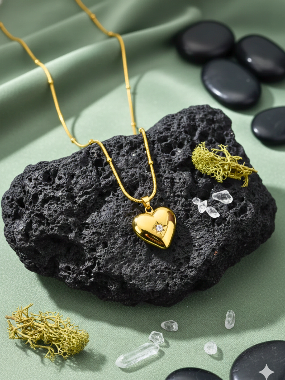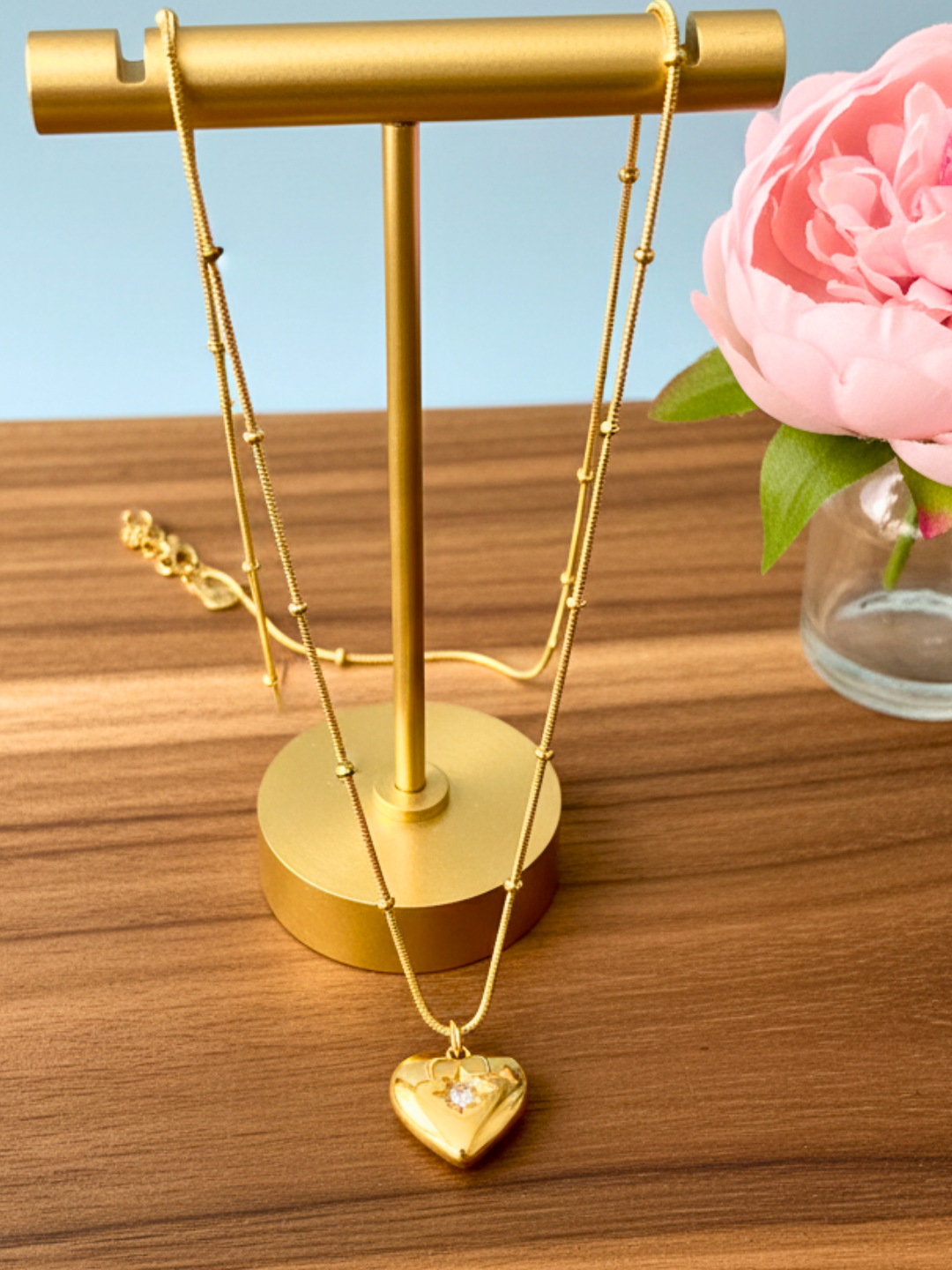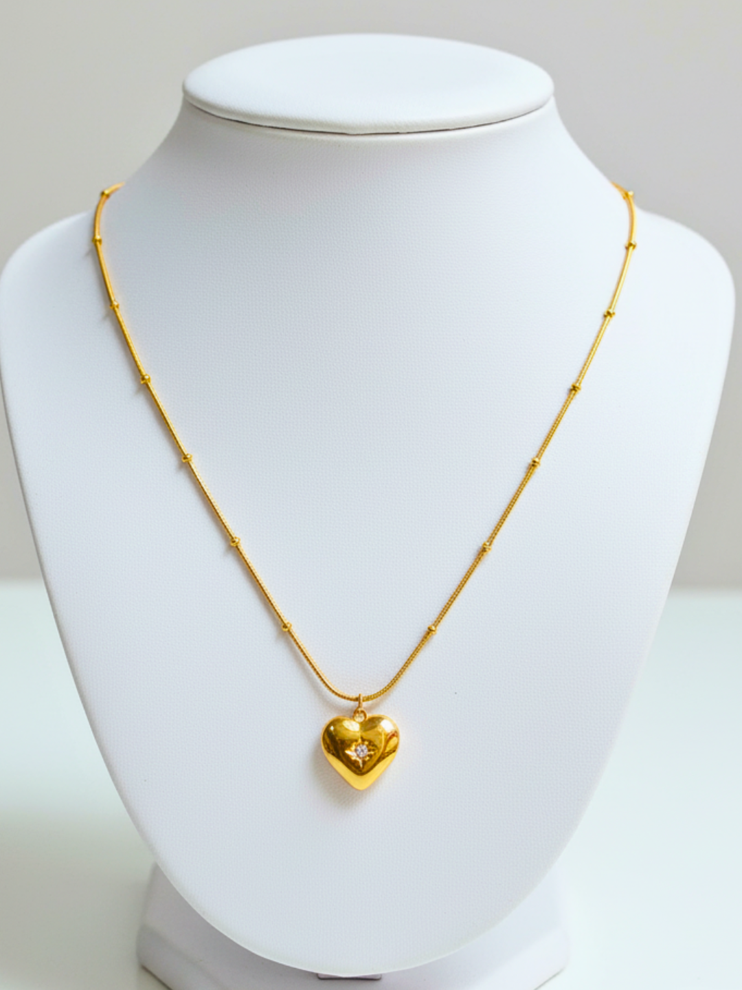 Refined and effortlessly elegant, this heart pendant chain is finished in luminous 18K gold plating with an advanced anti-tarnish coating to preserve its brilliance. Designed to feel light yet luxurious, it drapes beautifully on the neckline, making it a timeless statement of sophistication and grace—perfect for both everyday refinement and special occasions.