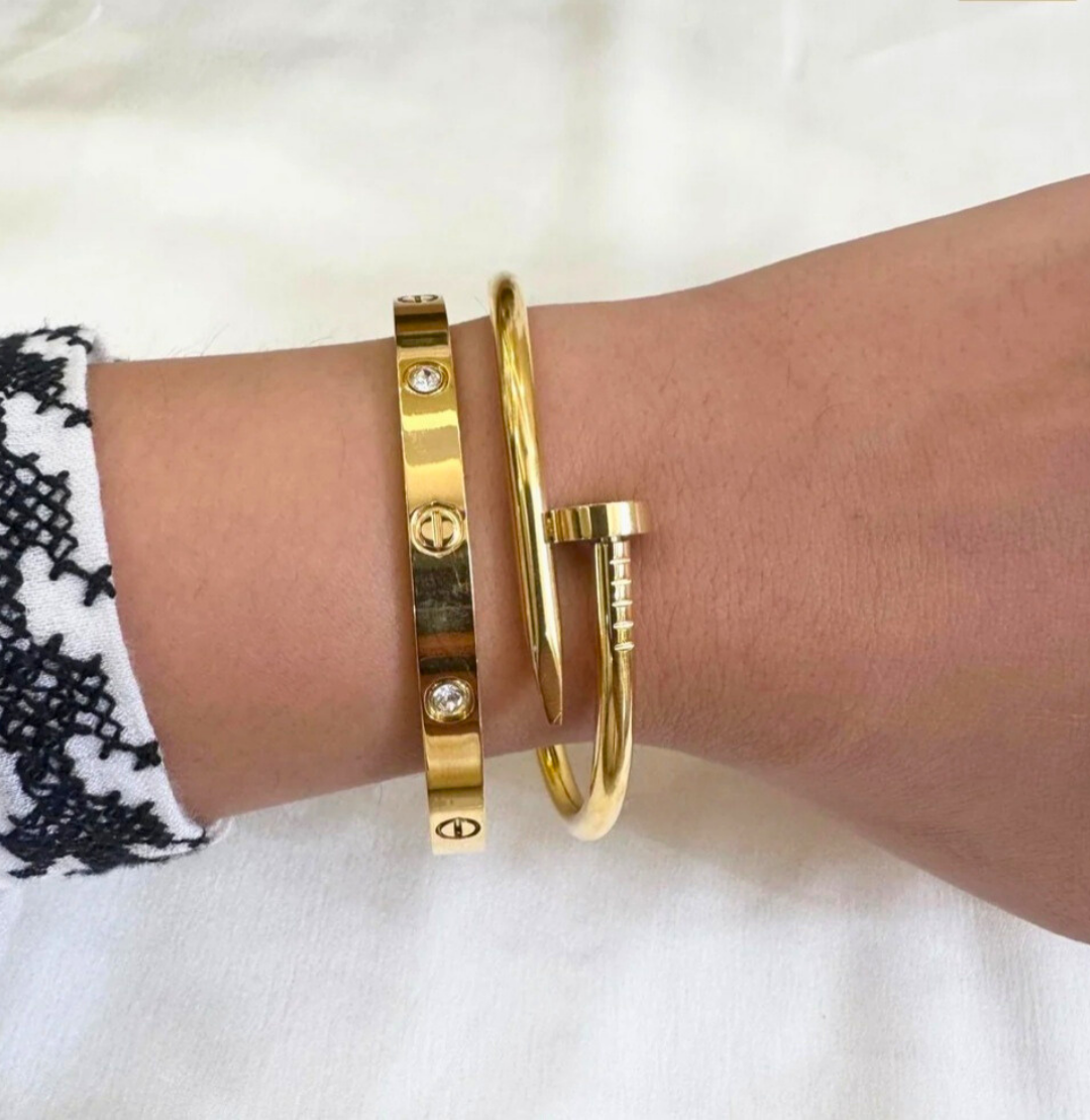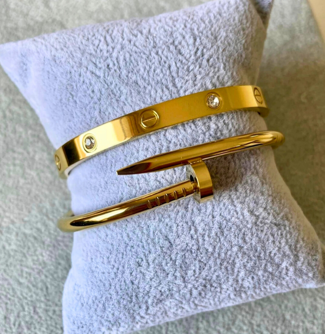 - Gold Bracelet for Women Set : A statement bracelet stack of 2 bracelets for women stylish combo : an elegant Anti-Tarnish Love & Nail Bracelet Women, crafted from stainless steel for enduring wear.