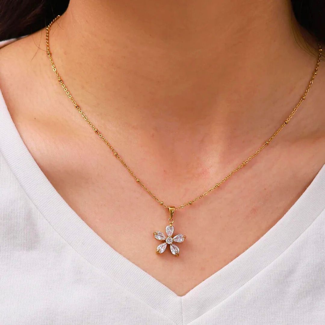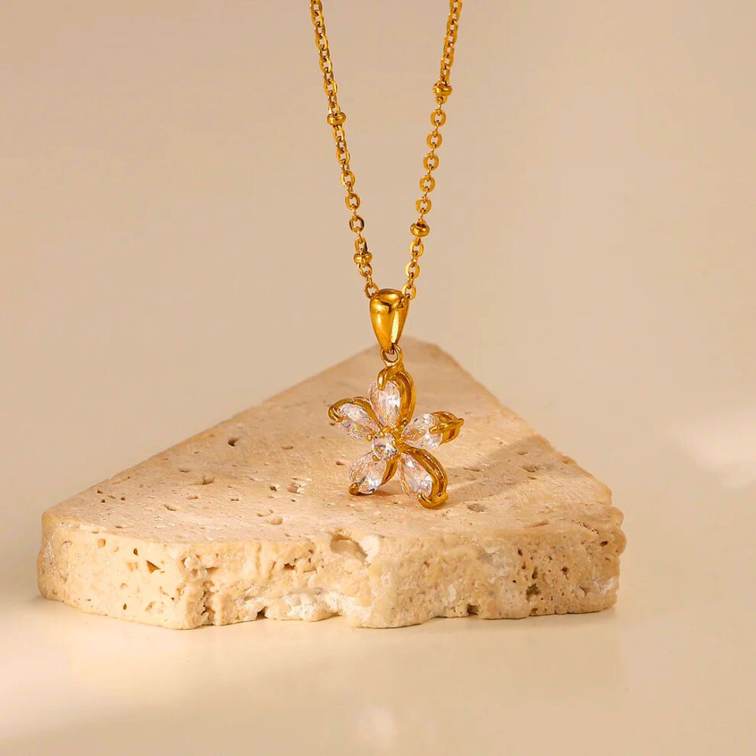 Cubic Zirconia Charm Five-Petal Flower Design Pendant with Chain Stainless Steel Anti Tarnish Gold Plated