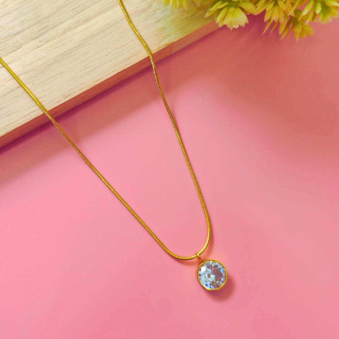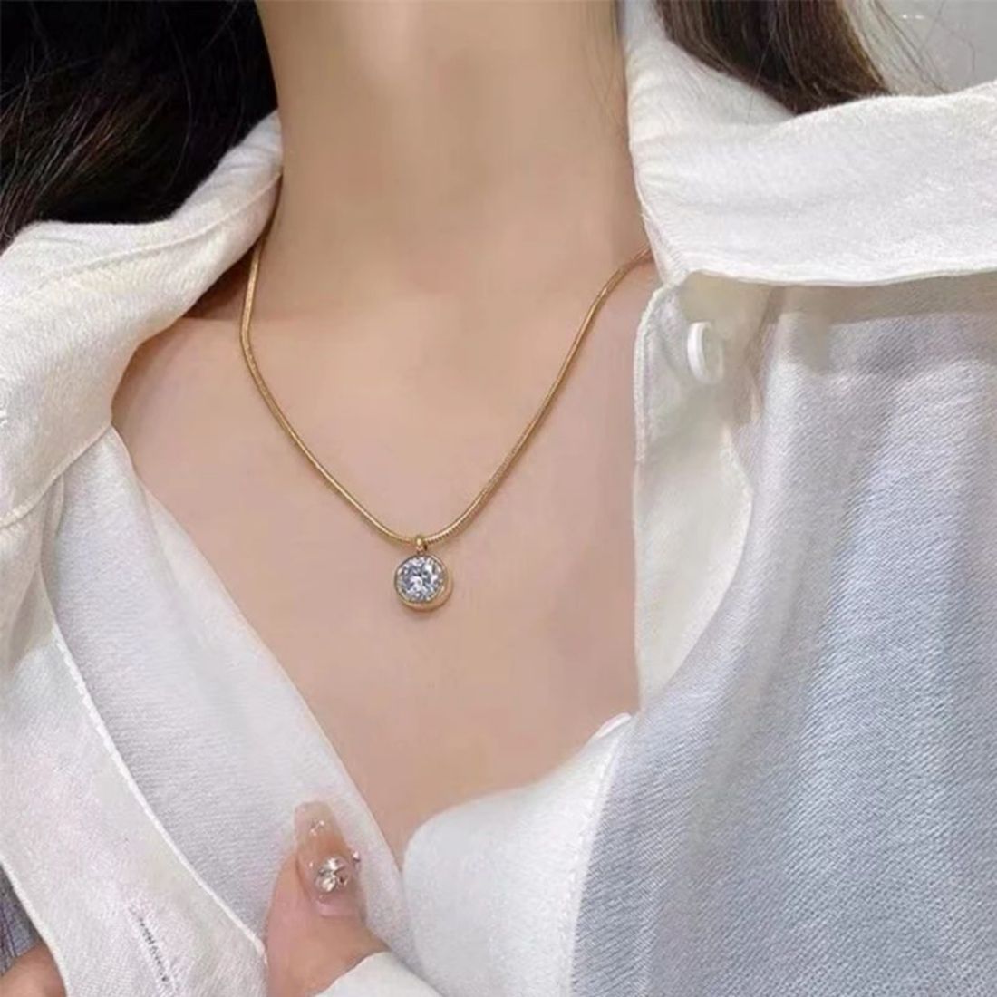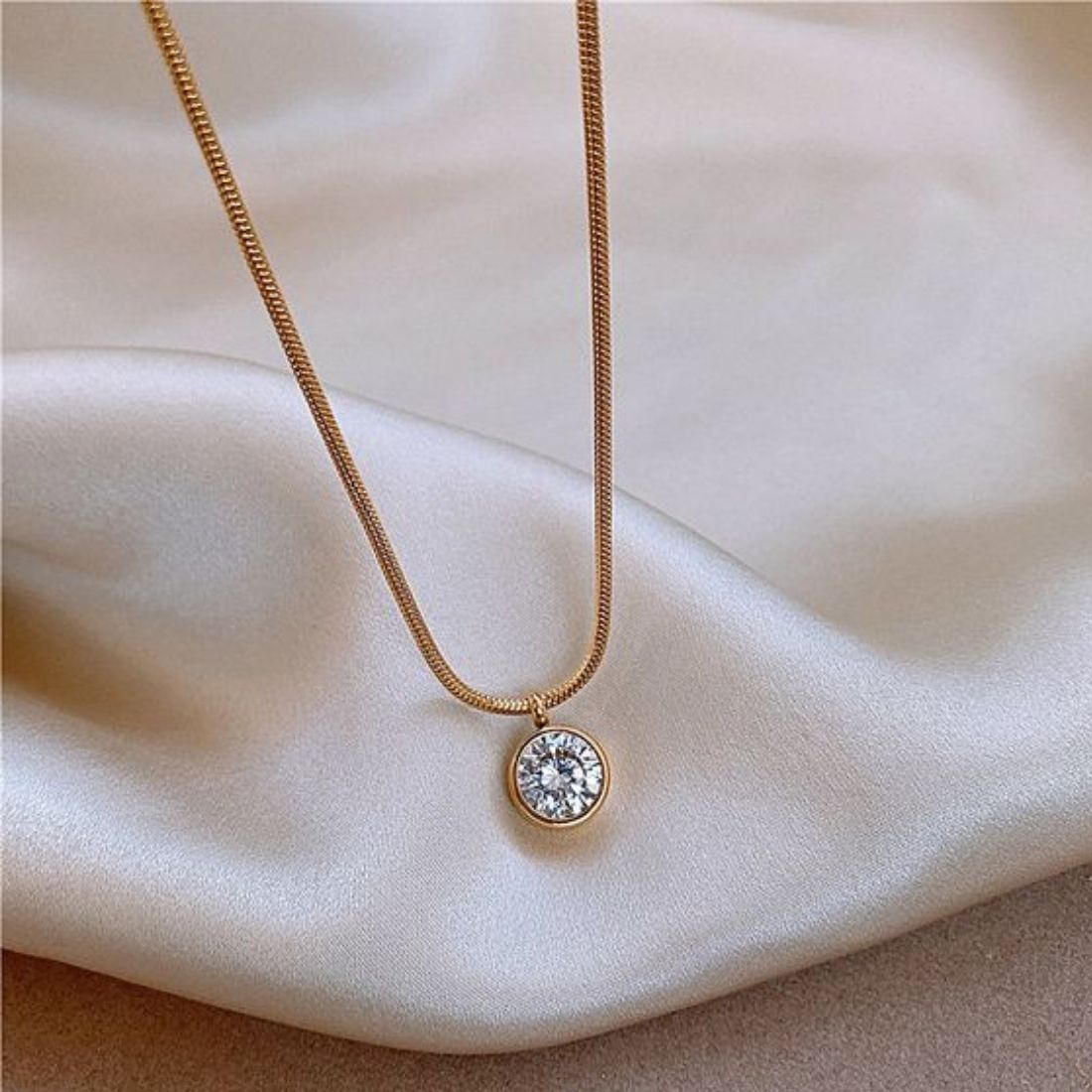 Pendant Design: Features a single, round, brilliant-cut cubic zirconia stone set within a gold-plated bezel or similar setting. The design appears minimalist and elegant, focusing on the sparkle of the central stone.