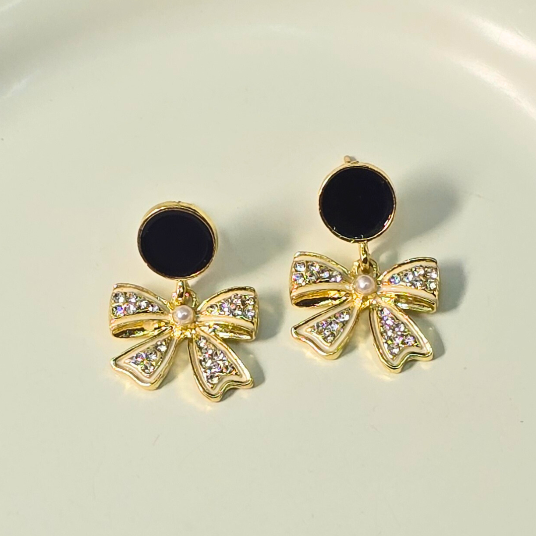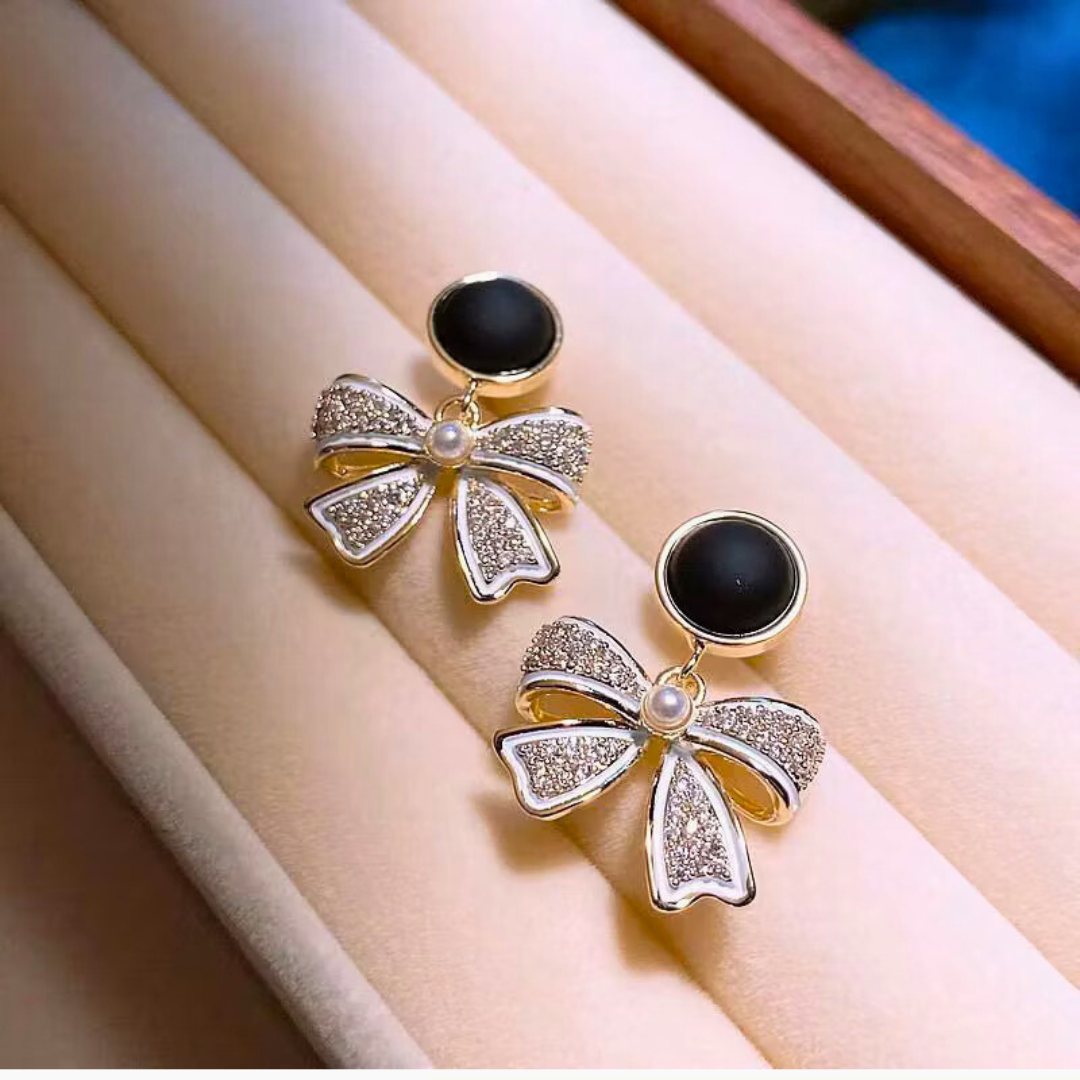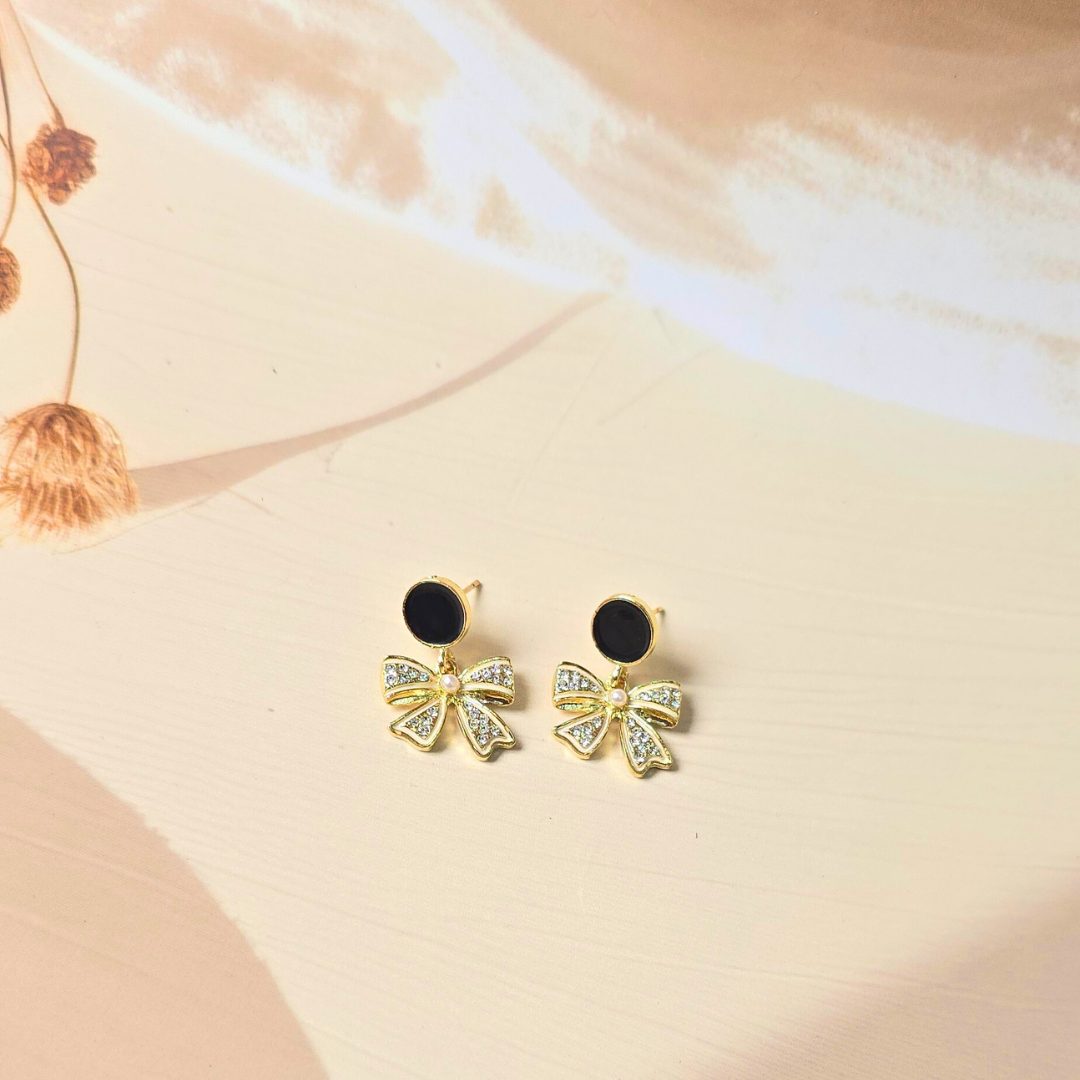 Description: These premium earrings feature a chic bow design, crafted to showcase a stunning black pearl as the centerpiece. The combination of the bow and the dark elegance of the black pearl creates a sophisticated and modern look, perfect for various occasions..